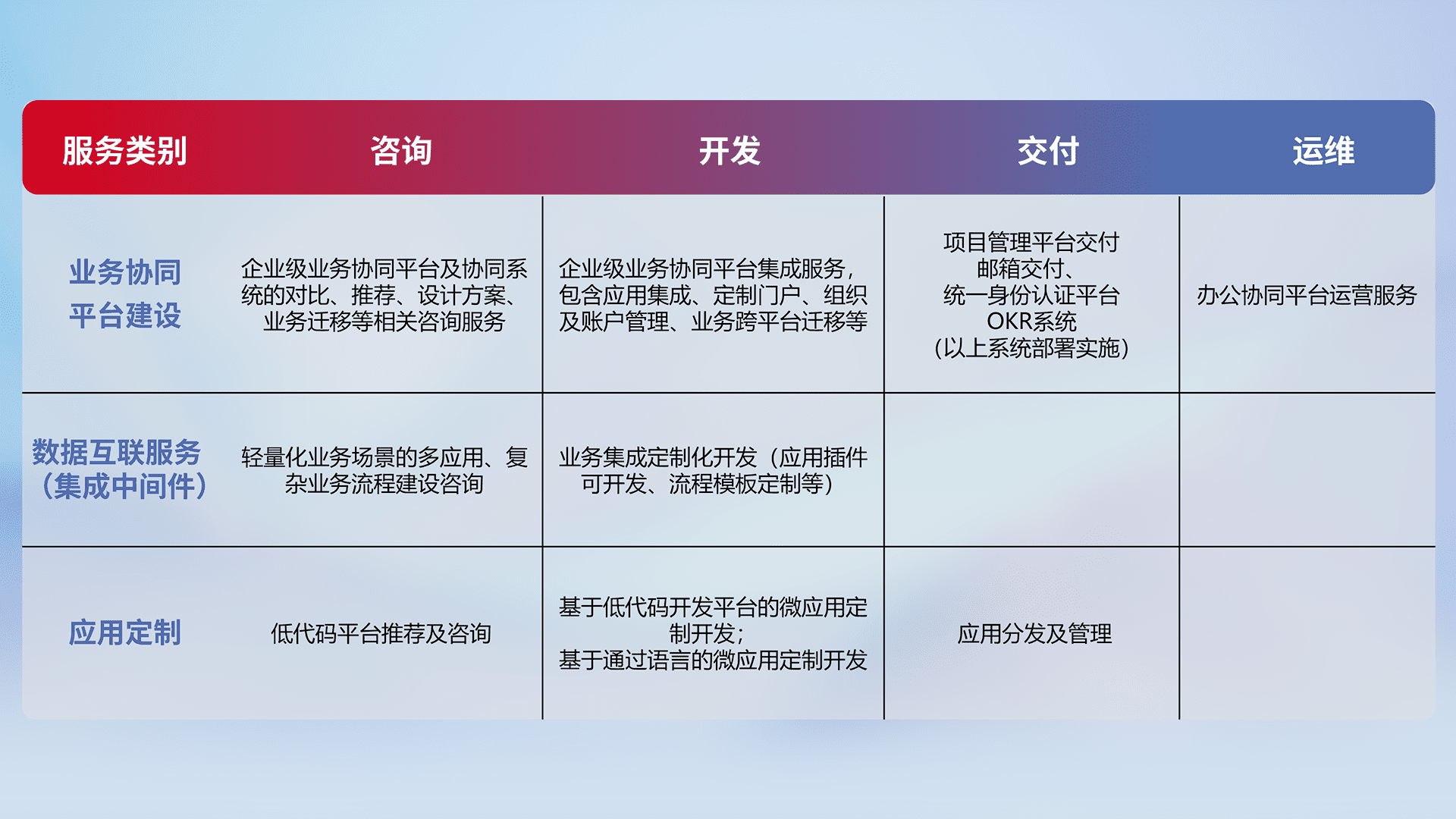 针对钉钉、、企微、、、、IDaas等平台级产品提供产品的规划、、方案、、、交付、、、、定制化开发等服务,,,,实现如统一协同办公、、智能客户服务、、、混合会议管理、、智能数据查询、、、、等业务场景,,,实现数字化转型。。。